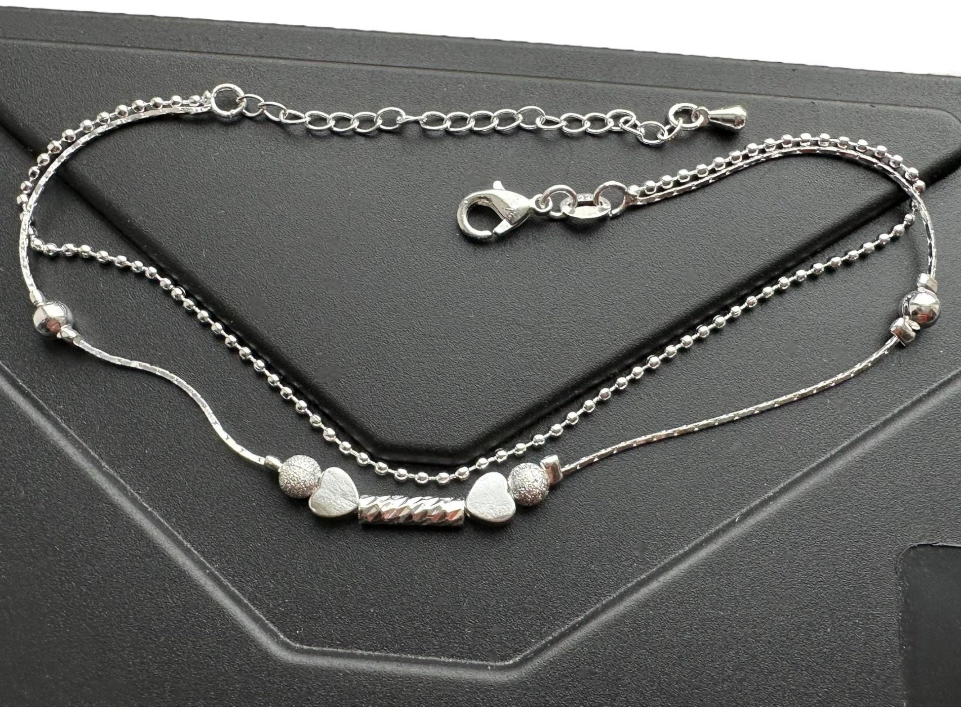 Heart Anklet Sterling Silver Double Layer Anklet Bracelet, Boho Beach Jewellery , Silver Anklet